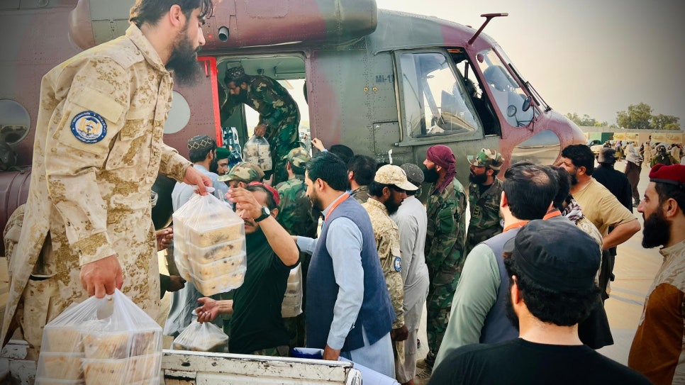 도로가 끊긴 지역에는 헬리콥터로 지원 물자가 전달되고, 부상자 이송도 이루어졌다 (9월 1일, 쿠나르주 누르갈 군 피해 지역)